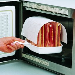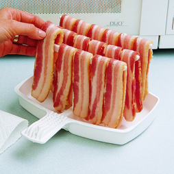 4) Place the Makin Bacon® dish in the center of your microwave oven. Cook bacon on high power for one-half to one minute per strip. (NOTE: Cooking times will vary.)